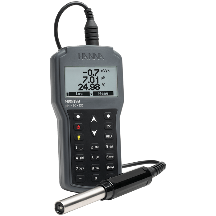 Para los científicos y profesionales que requieren mediciones precisas en el laboratorio o en la planta de producción, el HI98199 es un medidor versátil que puede medir el pH, CE, y el oxígeno disuelto cuando se le conecta el respectivo electrodo o sonda. Este versátil medidor se adaptará a sus necesidades específicas y su carcasa resistente le proporcionará varios años de medición ininterrumpida.